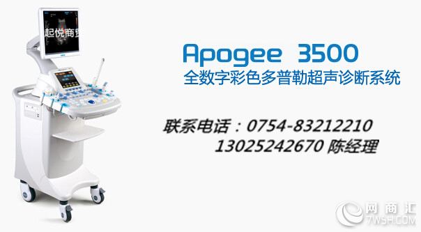 汕头彩超Apogee3500 全数字彩色多普勒超声诊断系统 汕头彩超Apogee3500是SIUI为医学界贡献的新创作。她采用了多种先进的成像技术,具有高清晰的图像品质,丰富实用的功能,适用于全身各部位的超声检查,使超声医生在工作中感受先进技术带来的诊断乐趣,使画着在检查过程中体验到先进技术带来的安全舒适。 触摸屏操作:Apogee3500采用了彩色触摸屏操作系统,医生对当前的操作一目了然,更简单快捷地完成工作。 斑点柔化技术(SRTech):系统自动跟踪识别有用组织特征信息,对这些信息进行强化,同时滤除噪声,提高信噪比。使组织分界更加清晰,图像层次感增强,易于分辨早期病变。 实时三维超声:Apogee3500拥有高密度的容积探头,保证了其实时三维超声成像的效果。而且探头小巧轻便,符合医生操作常规二维探头的习惯,降低操作强度,提高诊断效率。 频谱包络:医生可选择全自动实时包络频谱,也可选择手动包络或选择起始点进行自由包络频谱,并自动分析显示出PSV、EDV等各种血流懂力学数据。 浏览视窗:对当前保存的诊断图,在屏幕下方保留浏览图,方便医生随时调用进行对比分析。 提醒成像/拓宽扇形成像:扩大视野范围并且不降低图像质量,显示更多的图像信息,在检查较大面积的脏器时尤其方便。 高精度全数字成像技术; 组织谐波成像(THI)技术,梯形成像(线阵探头); 彩色多普勒血流成像,多普勒频谱; 三维(3D)成像,宽视野成像; 大容量、可编辑的电影回放; 强大的图文管理、通讯传输系统、DICOM3.0; 丰富的测量与临床分析计算功能; 内置的工作站; 强大的检查类型预置、图像标注、系统设置功能; 相控阵等超宽频带、高密度的探头选择群; 15英寸高分辨率彩色显示器; 造型优美新颖,发光键盘,3探头插座; 采用全数字成像、谐波成像、自动优化等多项新的成像技术, 图像清晰细腻,具有多普勒血流和频谱成像、三维成像、宽视野成像、梯形成像、大容量电影回放、图像软盘/硬盘/可擦写光盘/U盘存储和DICOM通讯传输、内置工作站图文管理、丰富的测量与临床分析计算等强大实用的功能,可配相控阵等超宽频带、高密度的探头选择群,广泛适用于腹部、妇科、产科、心脏、小器官、外周血管及前列腺等不同的临床诊断。