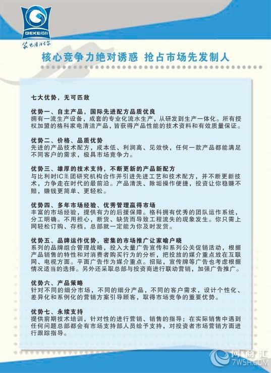 90后小伙刘国斌大学毕业3年依然身无存款,25岁的刘国斌无比的苦恼,看到身边的同学和同龄人都收货了爱情和事业,而自己还一无所有,他一直在等待机会。 一次偶然的机会让他了解到家电清洗行业,让这个踌躇满志的年轻人充满了好奇,迫不及待的要深入了解家电清洗行情、发展潜力、国内现状。联系上格科总部符勇经理进行一番详细了解后,此时的刘国斌隐隐的感觉到属于自己的机会来了,他当机立断,辞掉上海不足4000元的工作,回湖南老家创业。 回到老家后,经过一个星期马不停蹄的市场调查、利用自己在大学所培养的敏锐消费分析能力,很快做出一份市场调查报告交给父母,刘国斌的父母也非常支持儿子自主创业,"传统行业在我们当地已经被人做透了。只有新新的行业才是年轻人的机会,家电家家户户都有,而给家电搞卫士的专业公司确是空白,我们坚决支持儿子创业"刘父如是说。说干就干,刘国斌一家人动用了所有的资源找到一个成熟小区的外围店铺,年租2万无转让费,拿下店铺刘父后立马陪刘国斌到海南格科总部考察。 通过在网上对格科家电清洗的有所了解,又通过对总部工厂实力、生产能力、技术培训、市场方案学习之后更坚定了这对父子对行业的信息,签订合同、初步选择投资2万元搭配订单、装修店面开业。 在当地的市场运作过程中,不断积累经验和总部深入沟通,通过短短3个月时间就收回了前期所有的投资成本,刘国斌满足了自己创业梦想的同时也带动亲友的就业。 新的一年里,刘国斌也收获了自己的爱情,即将有自己家庭。此刻的他加大力度发展乡镇市场,朝更高的目标迈进。我们衷心祝福这位年轻人。 在格科的代理商系统里,类似的创业故事很多,只要敢想敢干,人人都有飞上枝头变凤凰的一天。 项目概况 格科是国内早(1999年)家电清洗连锁品牌,目前也是国内大的家电清洗产品生产厂家(专业从事这类产品生产的厂家,目前仅格科一家,**一些日化厂家有附带做少量品类产品),从产品销售及售后服务每一个环节,实施全过程的严格检验和有效控制。提供给代理商全系列清洗剂、清洗设备、宣传促销用品、技术支持、市场指导。帮助代理商在所在区县批发零售我们的系列产品,以及从事专业的上门清洗电器服务 格科家电清洗符浩在一项针对2000多个家庭住户样本的室内污染状况调查中,结果显示:50%以上的家庭室内存在着污染,而“罪魁祸首”就是家用电器。 调查问卷统计数据显示:92%的消费者有家电保洁需求,其中65%的消费者曾找过市面不专业人员进行清洗保洁,效果不尽如人意,消费者一直苦于无法找到一个放心的家电清洁服务品牌!同时接近86%的被调查消费者表示,如果有专门从事家电清洁的品牌公司,他们愿意接受服务! 家电清洗行业优势: 目前市面上普通“街头游击队”开展的油烟机清洗、空调清洗等家电清洗服务其清洗技术根本不专业,清洗效果也不理想,技术和服务也不规范,收费更是非常混乱,市场亟待出现专业正规的公司提供家电清洗服务。正因如此,说明家电清洗服务业蕴藏着巨大商机。 有电器的地方就需要清洗! 在我国一线城市,空调、洗衣机、油烟机、热水器、冰箱等电器的普及率几乎达到100%,二三线及县级以及乡镇普及率也达到85%以上。全国主要一二线城市每年家电清洗服务市场破千亿元。家电清洗的目标客户主要为公司企业、机关单位、酒店、宾馆、学校、工厂、网吧、娱乐场所,以及普通家庭。凡是有电器的地方都有家电清洗服务的目标客户。 家电清洗市场分析 有家电的地方就有市场,家电清洗剂、消毒剂是一次性消费品,家电需定期清洗保洁,是每一个现代化家庭都需要的,家电清洗市场很大。 开个家电清洗服务店,随着消费者的环保、健康、安全、卫生的意识越来越强,生活越来越好,越来越注重健康安全卫生,所以家电每家每户都有,有家电就要清洗,这是巨大的市场商机!不但能卖产品、上门清洗、还能树立商业口碑;无论是对未来的职业道路还是赚钱生财都是佳选择! 如今,家居健康有了新概念,家电也需要消毒、杀菌、清洗了。目前大多数消费者没有这个消费理念,没认识到家电细菌带来的危害,就如:洗衣机、空调、冰箱、油烟机内藏的细菌没有这方便的意识,随着人们生活水平的提供,家居健康会逐步得到人们的关注,网上关于家电健康方面的问题已经屡见不鲜了。还有一点就是关于家电在使用过程中产生的水垢的问题,众所周知,只要用水的地方就一定会产生水垢,北方地区尤为明显,水垢的产生不久影响家电的使用效率,造成热效率下低、管道堵塞等等、而且产生的细菌还严重影响人们的健康。可是凭简单的手工清洗根本起不到效果!这,就是一个巨大的商机,想想吧,只要用水就有水垢、有水垢就需要清洗、只要需要清洗水垢就需要专业的产品、就有巨大的市场! 效益估算 家电清洗效益估算(以空调清洗为例仅供参考) 行业调查分析:按一个拥有2000户的住宅小区计算,每一个家庭的空调平均3个月洗一次(一般一年至少洗一次),平均60元/次(材料成本:4-5元,主要是人力成本),60?2000=120,000元。若同时清洗油烟机、空调、热水器等,一般同时经营10个社区,年利润相当可观。 除了做清洗服务,您还有更多市场盈利操作方案——走家电渠道、产品直销、批发、招下级代理、网店…… 如果再增加**家电清洗项