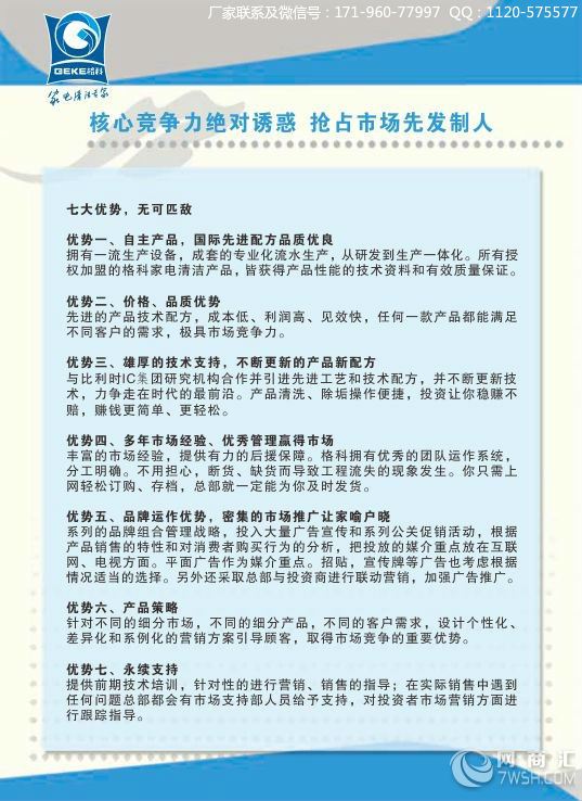想赚钱,就选家电清洗行业--稳赚! 你知道全国有多少家用电器吗? 有关调查显示,我国电脑的拥有量进1亿台,家用空调3亿台,油烟机1亿台,冰箱1.5亿台,饮水机1亿台......根据国家相关统计部门测算得知:饮水机清洗的市场份额已经达到180亿元/年,并且以每年19%的速度递增!单是饮水机清洗就有如此惊人市场,更何况油烟机,空调,太阳能......一旦进入家电清洗领域,获利不凡可想而知!(厂家联系及微信号:171-960-77997) 家电清洗起步门槛低,投资小,见效快,利润高,风险几乎为零!这个新行业已经在许多城市兴盛起来!海南美佳科技精细化工有限公司,专业生产家电清洁剂,产品线广,覆盖20余种家用电器,产品全部是用于美的、TCL、苏泊尔、奥克斯、格力、海尔、皇明、安吉尔、科龙、奔腾、老板、国美、苏宁、永乐等上百家驰名家电企业的指定清洁保养产品,畅销全国多年,为进一步覆盖市场,现向全国诚招加盟代理商。现在加盟即可享受:0加盟费,0代理费.技术指导,指导运作模式等优惠政策! 加盟商店铺 格科家电清洗品牌邀您一起打造品质生活。格科创新财富先人一步。调查表明,68℅的疾病由室内污染造成,室内空气中存在致癌物质20多种,致病病毒20多种。室内空气污染程度比室外严重5倍甚至100倍。 饮水机内胆三个月不清洗就会滋生大量细菌、甚至红虫,成为 有毒"添加剂",引起消化、泌尿和造血系统病变,甚至引起早衰(厂家联系及微信号:171-960-77997)。 油烟机长期不清洗其吸附的污垢会增加,增大风叶运转负荷,降低排烟能 力,严重影响着油烟机运行的稳定性,终可导致短路,甚至引发火灾…… 空调使用二三年后,制冷效果会明显下降,电费却成倍增长。长时间呆在没 有清洗过或清洗不彻底的空调房里,会感觉心闷、头晕、四肢乏力……"空调综合症"引发的传染病、呼吸道疾病等,严重危害着人类健康电视、洗衣机、冰箱、电脑、太阳能…… 各种电器产品污染的危害越来越严重,来自信息产业部的一份关于国内电子产品污染的调查报告显示,由于保养方法不当而毁坏或引发的各类事故,每年给国民经济造成的直接损失近千亿元。 格科专业免拆清洗全国连锁, 创业路上,我们一直秉承自主研发,自主投资工厂生产的原则,力求带给加盟商及消费者更环保更天然的家电清洗产品。作为国内家电清洗行业开创者,美佳企业旗下“格科”品牌,已经成为中国家电清洁行业品牌,构建出公司坚固的核心理念,把握趋势,创新思维,诚信合作,谋求共赢。要做就做和别人不一样的服务,必须做技术专业、操作规范、服务标准、科学管理的特色服务。(厂家联系及微信号:171-960-77997) 格科加盟连锁经过15的发展,在生产、代理销售、技术培训、设备及环保清洁用品配送、保洁服务、新产品技术研发等领域取得了长足的发展,在环保清洁领域赢得了社会各界的认同与信赖,也为广大投资者提供了全新的市场空间和立业机会。 格科一直秉承着“安全诚信、专业高效、及时便利”的服务宗旨,将家电清洗服务做得更好、更专业的同时,格科也将不断的为想创业、正在寻找好的项目的有志之士提供更广、更便捷的服务平台,帮助每一位拥有创业梦想的人士,都能成就属于一份自己的事业! 格科全国加盟项目火热进行,在此诚邀有志之士的加盟! 想了解详细资料一定要加QQ 微信,或者来电话沟通 厂家手机联系:171-960-77997 或130-1622-8081 厂家咨询QQ:1120-575577 及微信号:171-960-77997 厂家项目负责人:符勇(经理) 我们长期为国内家电工厂提供OEM 业务
