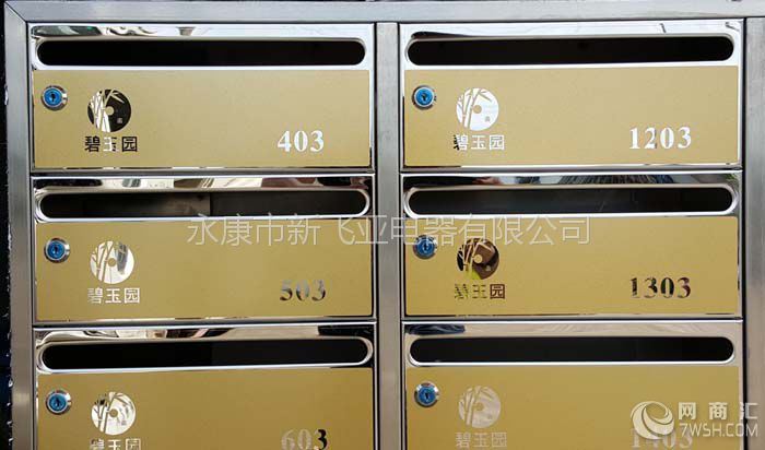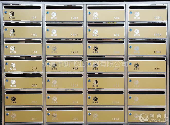 港口城市宁波北仑碧玉园不锈钢信报箱新飞亚信报箱有限公司友情制作 优材质:优质的1.0mm 304镜面板不锈钢; 新工艺:门面为反蚀刻喷土豪金砂; 巧结构:激光切割下料 数控无痕折弯 无缝氩弧焊接经打磨抛光而成; 标规范:国家邮政信报箱规范标准(横投类型340*140*240); 保安全:为确保人手安全每个信报箱柜边都进行卷边钝化处理; 名锁具:品牌铜芯邮政信报箱专用子母锁 用户配二枚钥匙 物业用母钥匙可以打开用户的箱门; 巧安装:附墙壁挂式安装; 有特色:信报箱门采用无铰链设计 强度达到500千牛; 强坚固:投递口采用冲裁新技术 门面的开启更流畅 更耐用; 慧服务:5年超长保养终身维护;