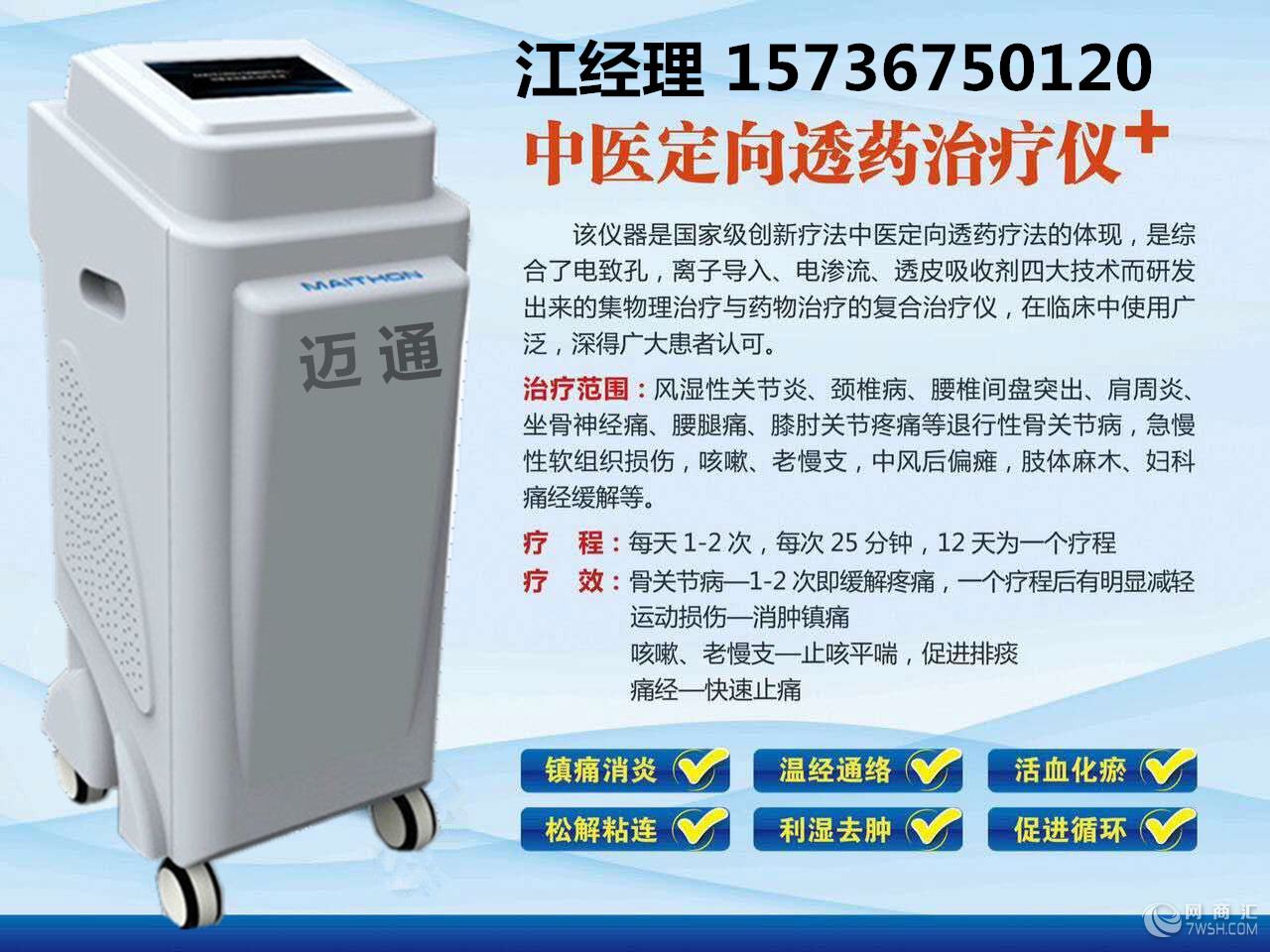 主要用于治疗颈椎、胸椎、腰椎、膝肘关节、手指、足趾等各类骨质增生疾病,以及神经根水肿、软组织挫伤、炎症、肢体麻木、肩周炎、腰肌劳损、关节扭伤、风湿性关节炎等症;在按摩状态下,对骨折愈合、疤痕粘连、胃痛、腹痛、牙痛、神经痛等疾病也有很好的疗效。 1、新型微电脑芯片设计,两路输出,多重安全保护功能。 2、特设的非对称中频电流将药物离子更深更有效的导入病灶部位。 3、远红外热敷,促进血液循环。 4、适用于家庭、医院保健治疗。 工作频率:中频2000HZ,低频0.3~120HZ 输出强度:(500欧姆负载) 定时时间:自动设定15分钟,人工设定1~30分钟 热疗温度:小于55℃ 热疗电源:0~5共6级步进调节 工作电源:交流220V50Hz?10% 功 耗:不大于30 配置清单: 主机(台) 1 吸水透热电极板(付) 1 自粘电极(赠品)(付) 1 弹性绷带(条) 2 用户手册(本) 2 1. 本仪器所用电源应是带地线的三芯插座,并接好外接地线。 2. 启动电源开关后再放电极板,摘掉极板后再关电源开关。 3. 关于治疗剂量的大小应因人而异,不能一味追求大电流。应以感觉舒适为宜。对皮肤感觉灵敏度差的患者更应注意防止烫伤。选择治疗剂量大小的原则是:小剂量对人体起兴奋作用,大剂量对人体起抑制作用,应根据病情需要选择适当剂量。 4、治疗时,必须用浸湿浸透的大厚棉垫,且大棉垫厚面下边是涂有药液的小药垫,小药垫下边是皮肤患部,否则易引起烧、烫伤皮肤。注:棉垫均应抻平,并与皮肤接实。 5. 医生应告诉患者在使用遥控器时若身体感到不适,应立即按住减键,此时输出剂量会逐渐递减至零,然后由医生酌情处理。 6. 医生在治疗过程中若发现某路患者有不适感或其它紧急情况均应立即按动该路复位键即可以使该路输出立即回零。 7. 患者使用过的小药垫、大棉垫应及时煮沸清洗消毒,防止交叉感染。 8. 应用本仪器进行药物导入时,所导入药物应在医生指导下进行。对人体导入有关过敏性反应的药物(例如:青霉素等) 应对患者进行皮试试验后适应者方可进行。 9. 心脏及心脏的投影部位、太阳穴、孕妇的下腹部、伤口及出血部位均不得作为治疗部位。 10. 对患有心力衰竭、严重心脏病及装有心脏起博器、恶性肿瘤、感染性炎症、破伤风、恶液质、有出血倾向、精神病患者及对直流电不能耐受者,均应禁止使用本仪器进行治疗。 性能特点: 1、脉冲治疗:治疗频率高,渗透能力强,可刺激人体更深层次经络和穴位,直达病灶。 2、数码技术:采用高科技数字电路、微电脑CPU数码芯片技术,汇集多种功能,产品性能稳定可靠,适用范围广。 3、设计先进、使用简单: A、设计轻巧、操作简单,阅读说明书后即会使用; B、采用彩色液晶显示屏(LCD)十英寸触摸屏,显示直观清晰 C、治疗操作全部采用轻触按键; 4、治疗模式多样:全新自我感觉模式,具有推、拿、按、敲、捏、揉、拔,捶、针灸等多种治疗模式,治疗模式丰富多样。 5、输出力度大,治疗输出强度可调。 6、治疗部位众多:本治疗仪采用先进的传统中医理论,结合人体经络学、生物物理学及现代数字电子技术,可对全身疼痛处做治疗,同时也可有针对性的对各病患部位做治疗。 注意事项: 1、注意不要把治疗电极一前一后放置心脏两侧。 2、使用过程中,如感觉不适时,请立即暂停使用。 3、两电极好成对贴于相对称的部位或邻近配穴治疗。 4、经治疗后,神经敏感度提高,可能有痛觉感,乃属正常。 5、两治疗电极应避免直接相碰、相触,以免损坏仪器。 6、请勿把高频手术设备和治疗仪同时连接到一个患者身上。 做治疗时,须将配件连接好后,才能开启电源和相应的输出强度;严禁先开启输出强度再连接配件,以免造成灼伤和仪器损伤 主治: 颈椎病、肩周炎、腰椎间盘病变、腰肌劳损、骨质增生、膝关节炎、坐骨神经痛、风湿性关节炎、类风湿腰腿痛、网球肘炎、臂丛神经痛、手脚麻木、肌纤维组织炎、软组织挫伤、腱鞘炎、中风后遗症、前列腺炎、妇科病等多种常见病;恢复骨病正常生理结构(曲度),达到复位的作用,改变骨病失稳,缓解或消除骨质增生;消除水肿、炎症、改善脑供血不足;解除压迫神经造成的疼痛;全方位调整骨病周围组织机能,消除病症。 六重功效: 电热敷疗效应 促进组织中渗出物的吸收与消散,加速对药气粒子的吸收。 远红外疗效应 消炎、消肿、解痉、祛风、驱湿、舒经散寒、活血化瘀。 交变磁场效应 磁疗能量起到消炎、消肿、降压、止泻、镇痛及活血化瘀等作用。 穴位刺激经络 疏通经络、调整气血、平衡阴阳、增强免疫力。 微量元素补充 导磁磁芯富含多种人体必需的量元素,达到补充效应。 中药粒子导入 内病外治、透皮给药、透皮吸收、恢复人体机能 概述: 智能数码多功能治疗仪是河南迈通医疗新技术有限公司生产的产品,该产品将中华传统医学的经络学与现代医疗学理论有机结合,并合理利用;把理疗学的温热效应、电磁效应、微波效应、红外线效应与人体穴位刺激经络相结合。该治疗仪机理是作用于经络穴位,进而对病变部位的生物磁场进行调节,使其产生一系列生理、生化反映以达到奇特的祛风除湿、温经通络、活血化瘀、散寒止痛的治疗作用,有效地起到了消炎止痛、解痉消肿、改善组织营养、促进血液循环、加速新陈代谢,恢复人体机能的治疗功效。治疗过程简单、方便、有效。1适应症