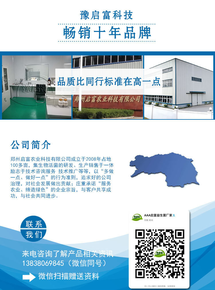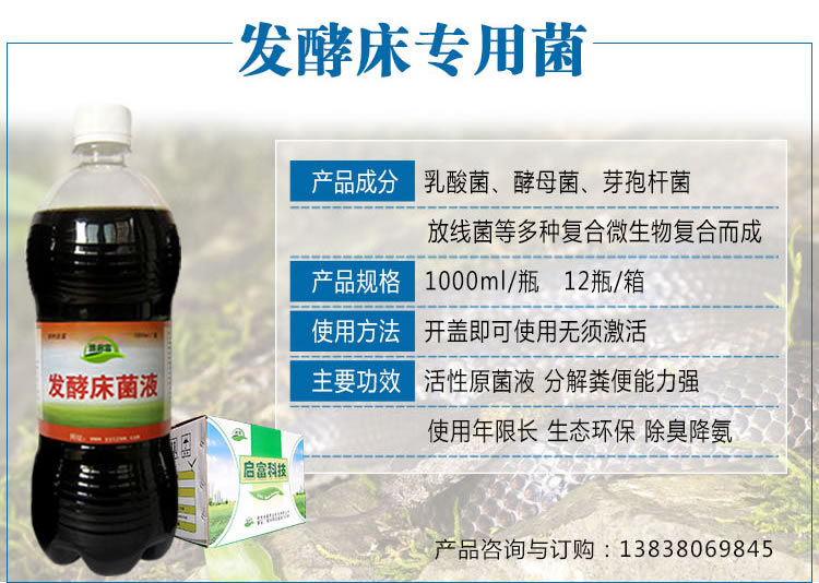 发酵床养蛇就是利用活性微生物复合菌群,持续、稳定地将蛇的粪尿排泄物转化为多种营养物质与能量,实现粪尿完全降解的无污染、零排放目标的一种新型环保养殖模式 。20180803poiuyt 产品名称:启富发酵床菌液(发酵床养蛇) 使用方法:养蛇发酵床的制作与维护 产品用量:1箱可制作12平方发酵床 保质期限:阴凉干燥密封18个月 准备垫料:锯末1立方、稻壳1立方,麦麸或玉米粉1公斤、将1公斤菌液加适量清水稀释,与垫料混合均匀;? 调控湿度:拌匀的垫料湿度一般为50%左右,可以用手紧握垫料,指缝没有水滴留下,潮潮的湿湿的,落地能散开; 制作完成:垫料打堆发酵2-3天后平铺在蛇舍即可使用,池养厚度一般为10-20cm。箱养厚度一般为3-5cm; 广西省南宁市的李先生,养殖一万多条蛇,粪便的问题令他忧心,去年,李先生无意中从网上看到启富公司推广的发酵床养蛇案例,感觉很新奇,他想人家都用了,我这养蛇也能用吧,于是,便联系了启富公司的技术人员进行沟通,经过三天的咨询与考虑,李先生决定采用启富公司发酵床菌液制作发酵床养蛇;发酵床养蛇取得了明显的效果,李先生很是高兴; 1、除臭环保:蛇的粪尿在启富发酵床菌液的作用下,分解为无臭气体被排放掉; 生态启未来!科技富四方!郑州启富农业科技有限公司!现面向全国各地级 市、县、区广招代理商!丰厚的利润空间!严格的区域保护政策!欢迎来电咨询!咨询热线:138-3806-9845(微-信)扫描下方二维码可获赠启富产品技术资料一份!订购提供全程技术跟踪服务!