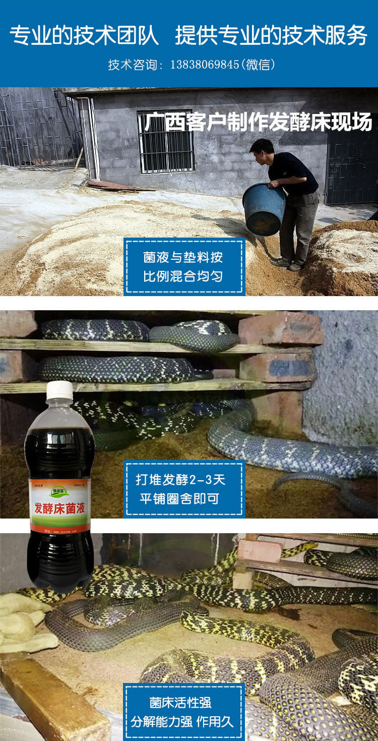 ?? 发酵床养蛇虽然优点众多,前提条件是选用活性发酵菌液制作发酵床养蛇,才能保障后期粪便被彻底分解,达到预期效果;启富养蛇发酵床复合型菌液,活性益生菌群,具有活性强,含菌量高,使用方便等优点,启富发酵床菌液制作的发酵床养蛇可以持续使用3年以上,淘汰的垫料又是很好的有机肥,可以二次利用施肥果树、菜园、花卉等;