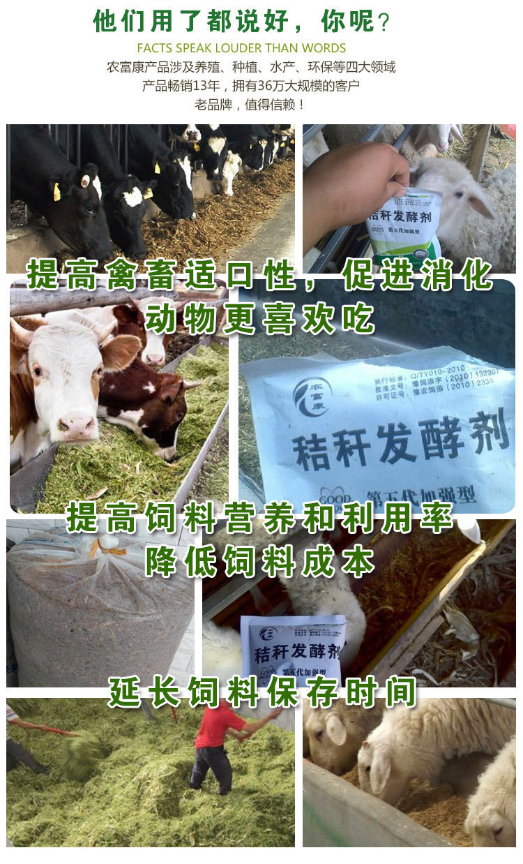农富康秸秆发酵剂的优势: 1:大品牌:农富康公司从2005年开始研发并生产秸秆发酵剂,如今已经做到第六代产品,生产工艺不断提高,产品品质逐年提升。 2:效果好:产品畅销全国十余年,无论是做青贮、黄贮、还是微贮,效果都非常不错,在全国积累了几十万的新老客户。 3:成本低廉:一袋发酵剂可以发酵2-3吨秸秆,每吨的成本价才10块钱左右,同时农富康为源头生产厂家,对于量大的用户和商家还可以提供代加工和批发价销售,这样成本更低廉。 4:全程技术指导:公司拥有几十名经验丰富的技术人员,无论是售前还是售后都可以提供详细的技术指导,真正的让您无任何后顾之忧。