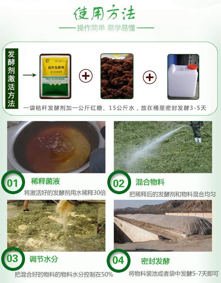 秸秆发酵剂 秸秆的来源广泛不管是玉米秸秆、小麦秸秆、水稻秸秆,还是花生藤、红薯藤、稻草、牧草等都可以发酵来做饲料使用,这些材料经过微生物菌的发酵后,