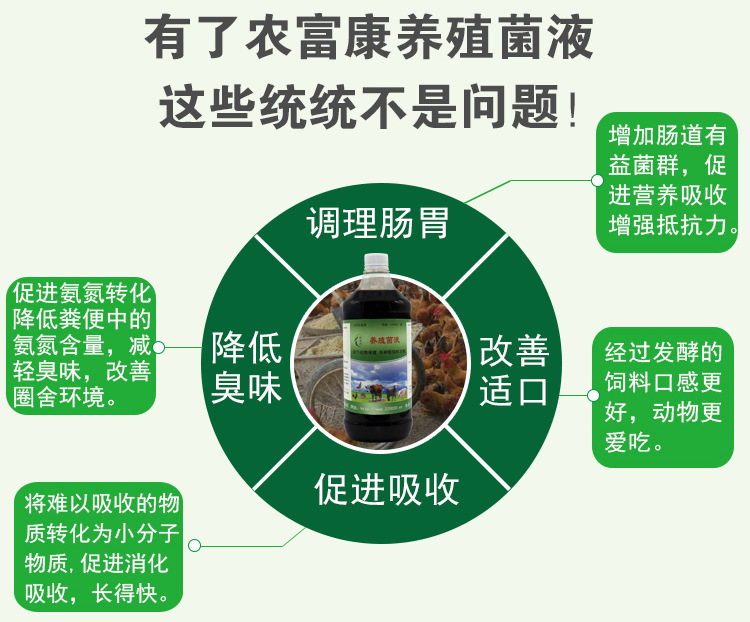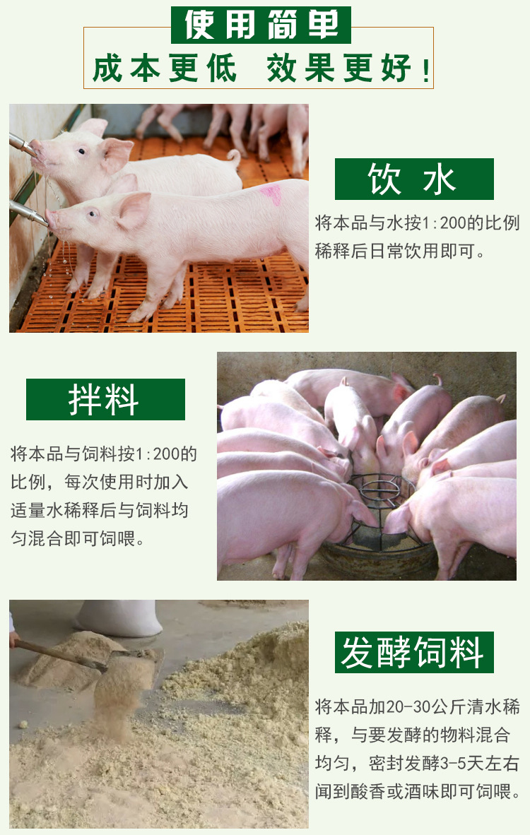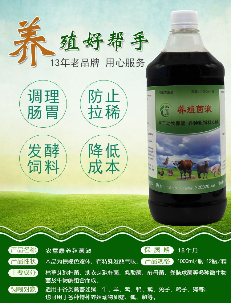 农富康养猪益生菌是专门为养猪研制的一款适合猪 用的益生菌,益生菌对猪肠道菌群有很好的调控作 用,养猪用益生菌可以很好的调节肠道菌群平衡, 、预防猪腹泻拉稀,降低氨臭,减少过料,提高免 疫力,降低发病率等; 农富康养猪益生菌主要成分有:乳酸菌、酵母菌、 放线菌、芽孢杆菌等多种有益菌复合而成的微生物 制剂,通过喂猪食用不仅能起到饮水保健,防病促 长的作用,还能提高猪对饲料的利用率,以及各种 肠道疾病,拉稀腹泻等有很好的预防效果; 1.养猪益生菌有效调整肠道菌群平衡,维持肠道正常的微生态,抑制大肠杆菌、沙门氏菌等有害菌的生长繁殖,促进乳酸菌、双歧杆菌等有益菌的生长,促进猪肠道健康。 2. 提高饲料养分的消化利用率,促进小猪胃肠道发育,提高采食量、日增重,降低料肉比。 4. 预防仔猪因断乳造成的腹泻下痢,增强肠道消化酶的活性,提高成活率。 5. 提供育肥猪所需的部分营养物质,能缩短育肥猪提早出栏,使毛色光滑,毛皮红润。 6. 明显改善猪的外观,突显种类特征。增加猪肉质和风味,胆固醇量下降20-40﹪。 7. 促进有益厌氧微生物在肠道生长繁殖,增强免疫力,提高抗疾病、抗应激能力。 8. 净化饲养环境,降低舍内氨氮等有害气体浓度,减少粪便中水分含量,除臭降氨气等。 农富康养猪益生菌针对猪仔,小猪,大猪,母猪,野猪等畜类提高免疫,增强抗病力,少生病,长的快,降低养殖成本; 1.饮水中添加: 1瓶菌液加水200公斤稀释,日常饮水,调节肠道,预防细菌性疾病 2.饲料中添加: 1瓶菌液混合200公斤饲料(精粗料均可)日常饲喂,防病促长,提高饲料利用率 3.发酵饲料: 如:豆渣,酒糟,潲水泔水,花生渣,桑树叶,牧草,等粗料;1瓶发酵500斤,提高饲料营养价值,促进动物肠道吸收,降低饲料成本 4.圈舍清理: 1瓶菌液加水30倍稀释,喷洒圈舍四周,动物身上,生物除臭降氨,降低硫化氢等有害气体,维护良好的养殖环境 农富康养猪益生菌生物制剂产品,喷洒猪身上具有杀菌消毒的作用,对动物和人没有伤害,无需担忧; 农富康生物科技有限公司位于微生物益生菌生产企业郑州市,为您提供专业的em菌 种 饲料发酵剂 养殖菌种 种植菌种等服务,秉承以客户为中心的服务理念,用心去 感受客户需求,公司主营添加剂、饲料添加剂、营养性添加剂,为客户提供好的产 品、良好的技术支持、健全的售后服务以及真诚的态度均得到新老客户的一致好评 ,你的选择不会错。农富康益生菌成分