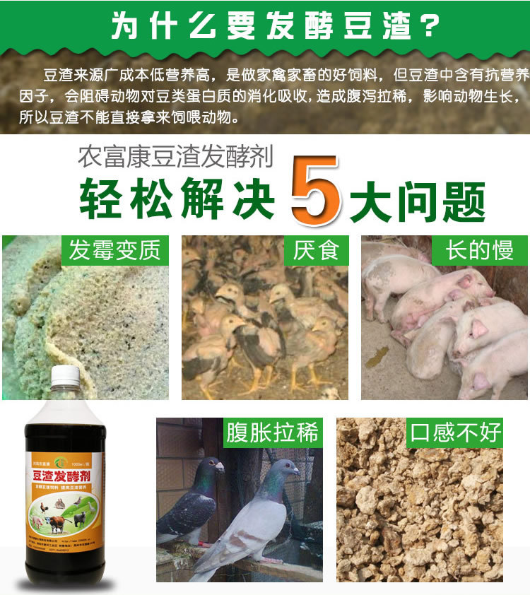 豆渣来源广成本低营养高,是养猪、养鸡、养鸭、养牛、养羊 等很不错的饲料替代品,豆渣原料价格低廉,营养好,来源广 泛,如果能利用好豆渣原料,就能更好的降低养殖成本。很多 养殖户也用过豆渣饲养,但是效果不理想。问题主要集中在豆 渣很容易发霉,造成浪费,怎么长期保存?豆渣喂猪吃了肚子 涨怎么回事?处理豆渣的土方法是蒸煮豆渣,通过高温把营养 变成小分子的,容易吸收,但是蒸煮耗费人工和燃料。不适合 大量处理豆渣。这种方法已经逐步被淘汰。 长时间保存呢? 1、降解豆渣抗营养分子 豆渣里边含有三种抗营养分子。这三种抗营养分子直接不 经处理么给牛喂的话 会造成肚胀拉稀,而农富康豆渣发酵剂是专门针对这一问 题研发生产的,发酵 剂里边大量的有益菌群能够分解豆渣里的抗营养分子让牛 能够吸收。 2、促进吸收好吃多消化 农富康豆渣发酵剂是由软酸菌、酵母菌、光合菌、放线菌 等一系列有益菌复合 而成,这些有益菌能够改善豆渣的适口性,让豆渣变得松 软酸香可口。从而更有利于牛的口味及吸收 3、降低成本改善肠道环境 有益菌进入牛的肠道内能够吞噬掉牛体内的有害菌,让牛 的肠道及身体处于一 个健康的环境,牛的抵抗力及抗病力也会大大提高。牛少 生病少用药长得快, 养殖成本低 4、排便不臭更符合环保 牛吃豆渣消化吸收好了。饲料的利用率高了。自然排出的 粪便臭味就小了, 这样一来不但符合现在的环保要求而且圈舍环境更有利于 动物的生长。 农富康豆渣发酵剂发酵豆渣喂牛的使用方法: 1、稀释菌液:农富康豆渣发酵剂1瓶可发酵200公斤豆渣, 将豆渣发酵剂加如 适当的水稀释菌液(加水是为了混合均匀,视豆渣水分干 湿而加) 2、混合菌液:将稀释好的豆渣发酵剂直接和豆渣拌均匀。 水分控制在50%合适。 3、密封压实:将混合好的豆渣压实密封,发酵3-5天即可 取出饲喂。 发酵后的豆渣饲料,有酒香或醇香气味,动物爱吃,可用来饲 喂鸡、鸭、鹅、猪、牛、羊等禽畜,饲喂时,应按照由少到多 的方式添加,比如周按10%的量,第二周增加至20%,以此类推 ,一般使用 农富康豆渣发酵剂发酵的豆渣饲料,可添加至40 -50%不影响正常生长。 过了才知道哦,我们农富康的豆渣发酵剂也不贵,自己可以尝 试下,毕竟别人说的再好,不如自己一试,农富康13年的老牌 子,成本低,质量有保证 。