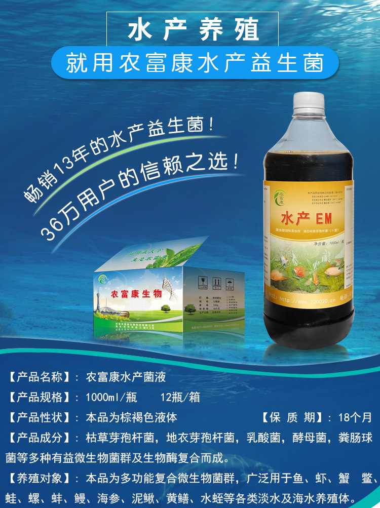 1.抗病、促长:泼洒农富康水产EM菌能吞噬水体中的有害细菌
