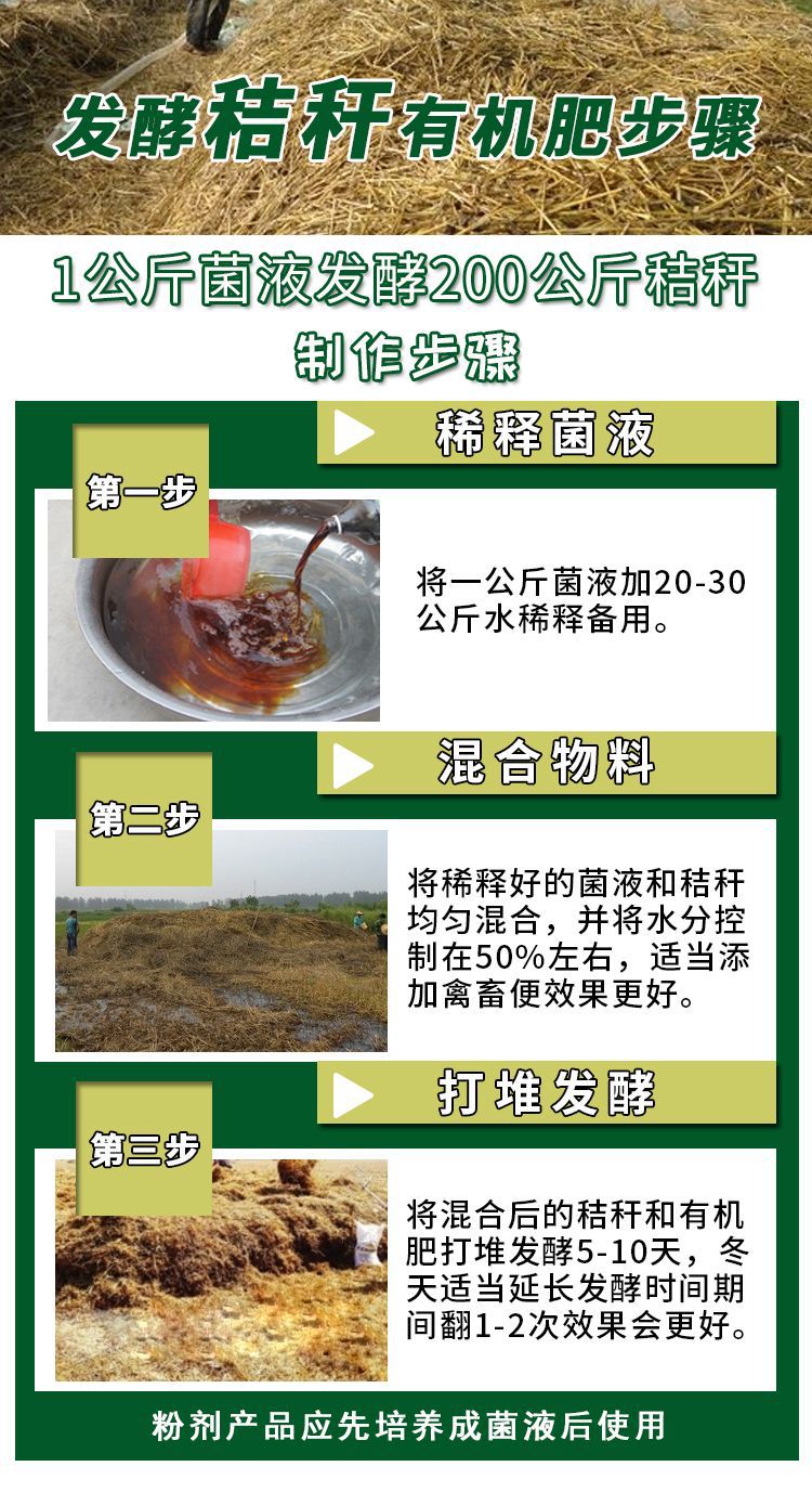 用法:1公斤菌液发酵200公斤小麦秸秆,菌液稀释20-30倍,翻动秸秆时泼洒稀释好的菌液,水分控