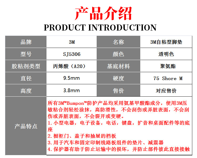 品牌:3M 型号:SJ5306 颜色:透明色 规格:9.5mmx3.8mm(3000粒一箱) 产品描述: 3M Bumpon防护产品为涂压敏胶粘剂的聚氨酯产品,全面的产品系列可广泛地用作底座、挡块、垫片和保护装置,帮助防止因为撞刮、切口、磨损、滑动或噪音等对产品造成的损坏。 产品应用: 1、小型电器、电子设备、电话、键盘、扩音和桌面配件等的底座。 2、烟木家具和木制品的挡块。 3、用于汽车和固定印制线路板组件的垫片、减震器。 4、用于堆砌的玻璃和金属板材的保护装置。 产品特点: 3M Bumpon防护产品采用聚氨酯为材料,具有耐磨,耐久等性能,和高粘性压敏胶粘剂配合使用,带来意想不到的效果。 1、极佳的防滑性 2、长期弹性,不会硬化,破裂 3、耐磨损 4、对低表面和粉末喷涂面具具有良好的粘合力 5、可代替机械固定件使用 6、耐切割和污染! http://www.smdjn.com