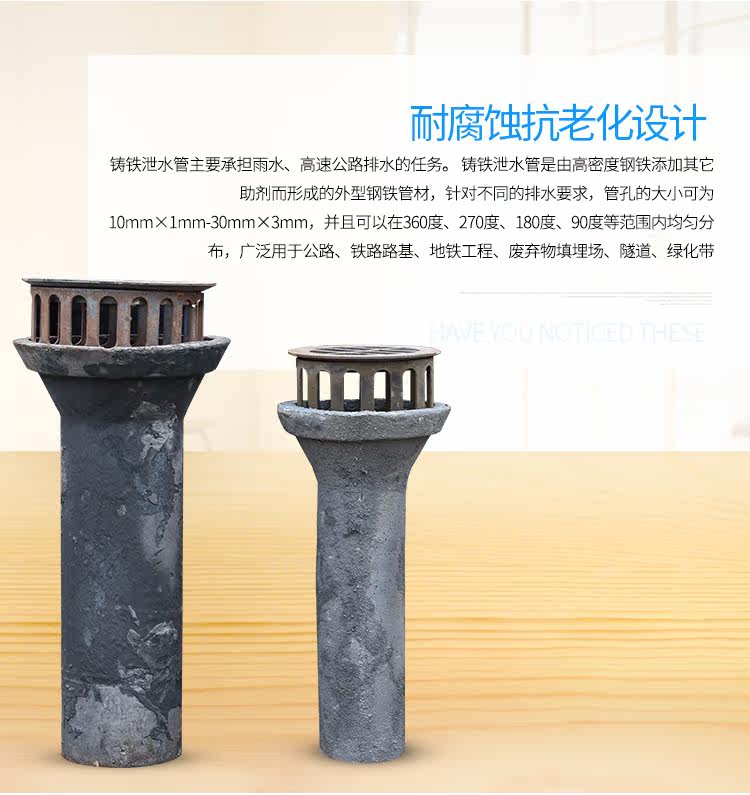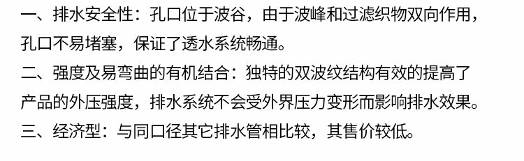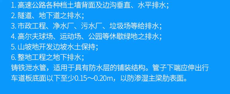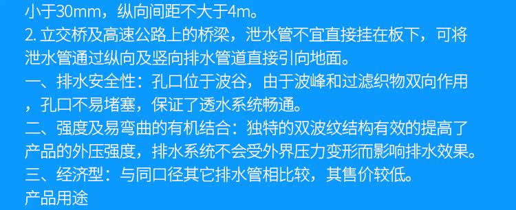 PVC泄水管通常外壁为白色,且不用作上漆刷、银粉等防腐处理,不存在如铸铁管外壁锈蚀脱落等问题。pvc泄水管的主要用处介绍。高速公路纵向、横向排水及透水。高速公路各种档土墙背面及边沟垂直、水平排水。隧道、地下道之排水。市政工程、净水厂、污水厂、垃圾场等给排水。高尔夫球场、运动场、公园等休歇绿地之排水。山坡地开发边坡水土保持;整地工程之地下排水。 PVC泄水管的工程使用优越性 PVC泄水管在工程使用中有铸铁泄水管优越性的知识。PVC管材较轻,其运输费用也得到明显降低。 按目前的市场情况,PVC泄水管价格仅为铸铁泄水管的80%左右。也就是说,单位造价每千平方米建筑面积节省建筑费用较同铸铁泄水管造价低。此外,由于PVC管材较轻,其运输费用也得到明显降低。暗装入管井中时不需经常维修,明装则比铸铁管优点更为显著。易清洗,对视觉效果妨碍较少,极大改善了人们的生活,工作环境,也方便了建筑物的物业管理。