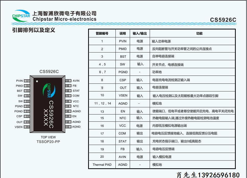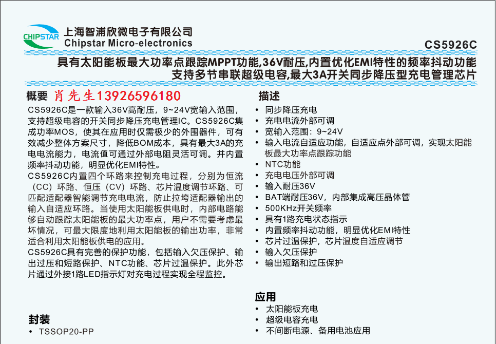 首页 专用集成电路 CS5926具有MPPT功能,36V耐压支持多节串联超级电容,3A开关同步降压型充电管理芯片